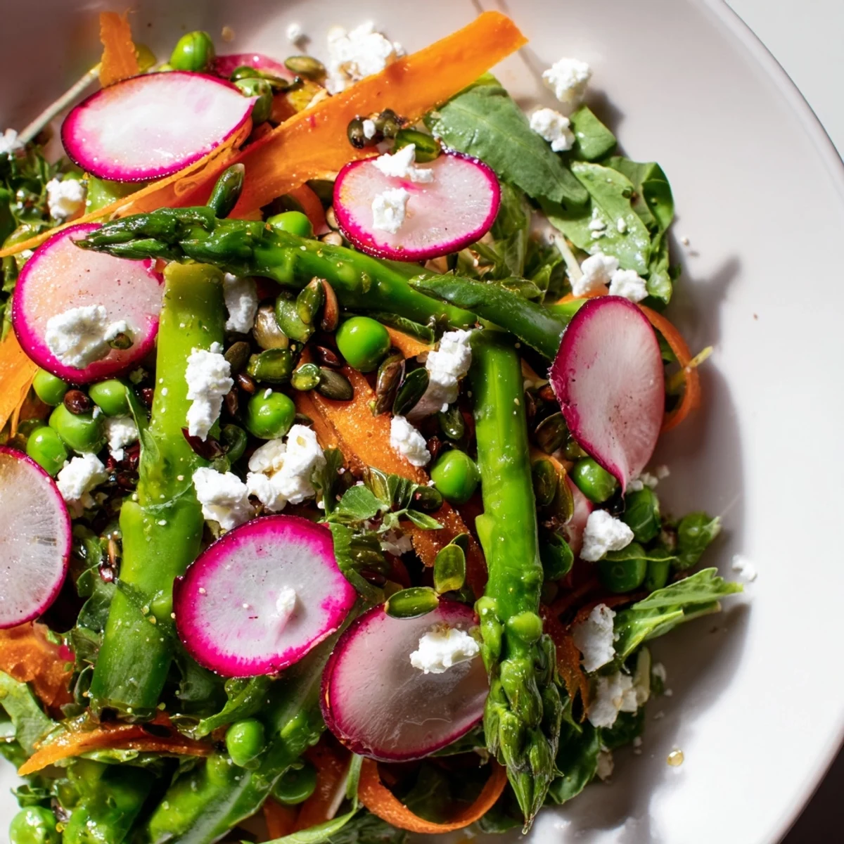 This bright spring salad combines baby spinach, mixed greens, thinly sliced radishes, cucumber, and blanched asparagus with fresh peas and delicate carrot ribbons. A zesty lemon-honey vinaigrette ties everything together, while crumbled feta and toasted sunflower seeds add satisfying texture. Ready in just 20 minutes, this vegetarian and gluten-free dish celebrates the season's best produce with every crisp, refreshing bite.