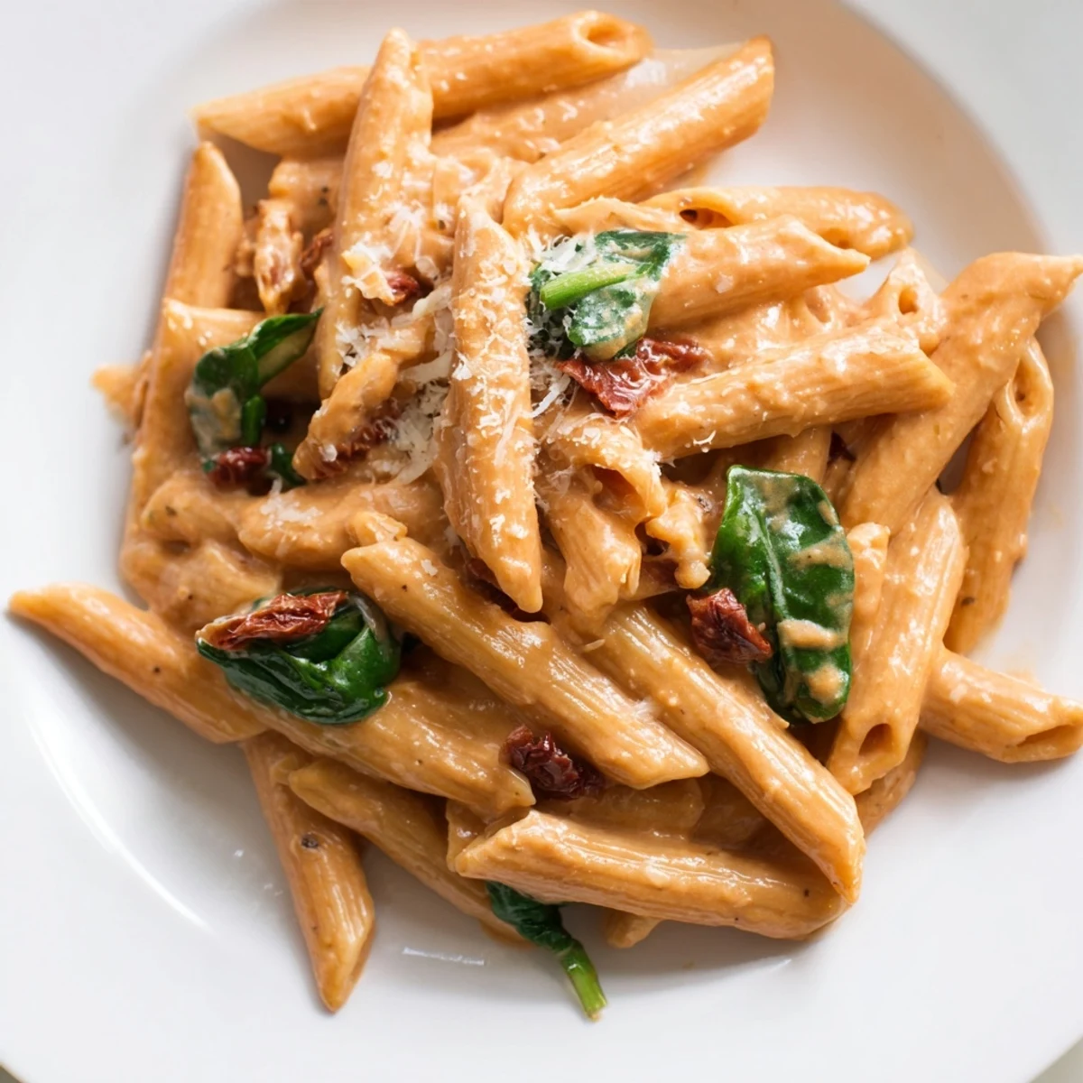 This one-pan pasta brings together the intense sweetness of sun-dried tomatoes with fresh baby spinach in a luxurious cream coating. The magic happens as the pasta cooks directly in the broth, absorbing all those savory flavors while starches release to create that perfectly clingy sauce.