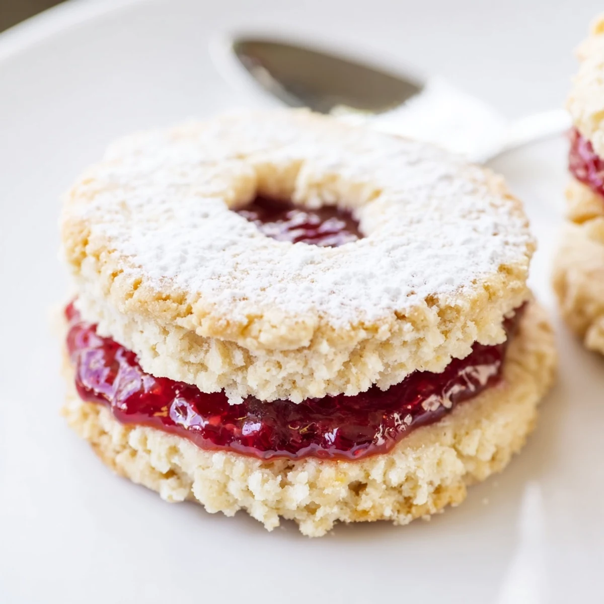 - Drop a half teaspoon of raspberry-lemon jam on a solid cookie, top with a cutout, and press gently—optional: sift powdered sugar over the tops for that picture-perfect finish.